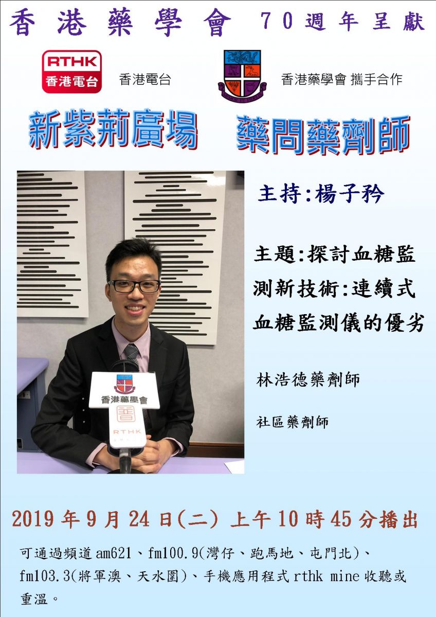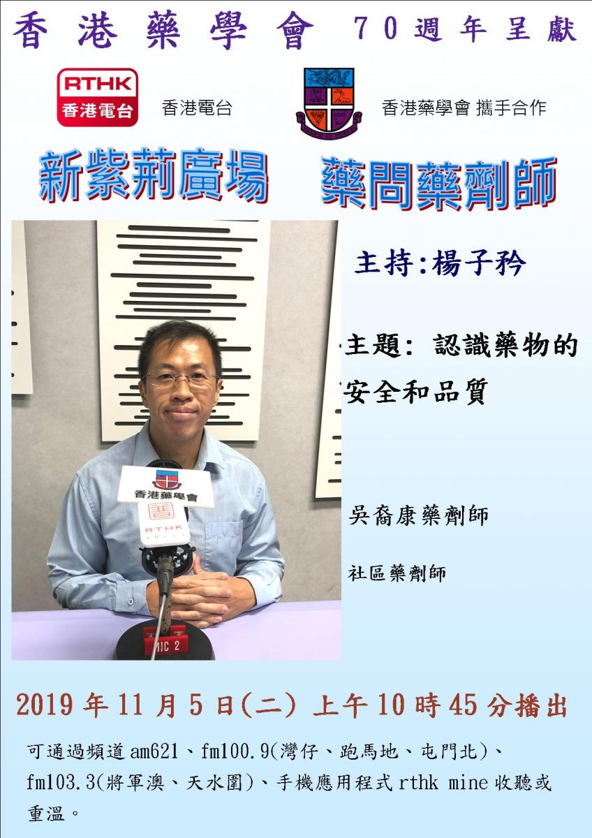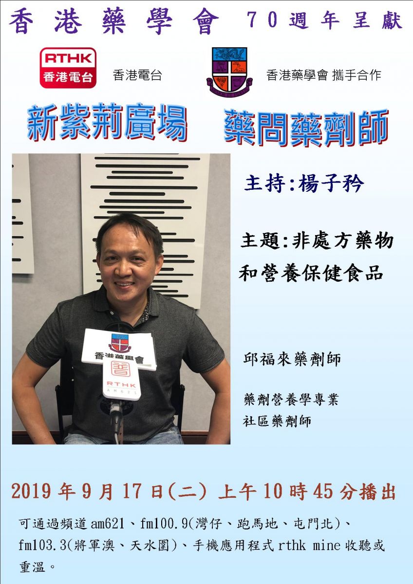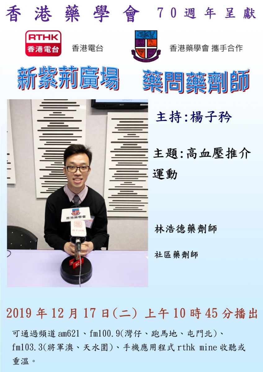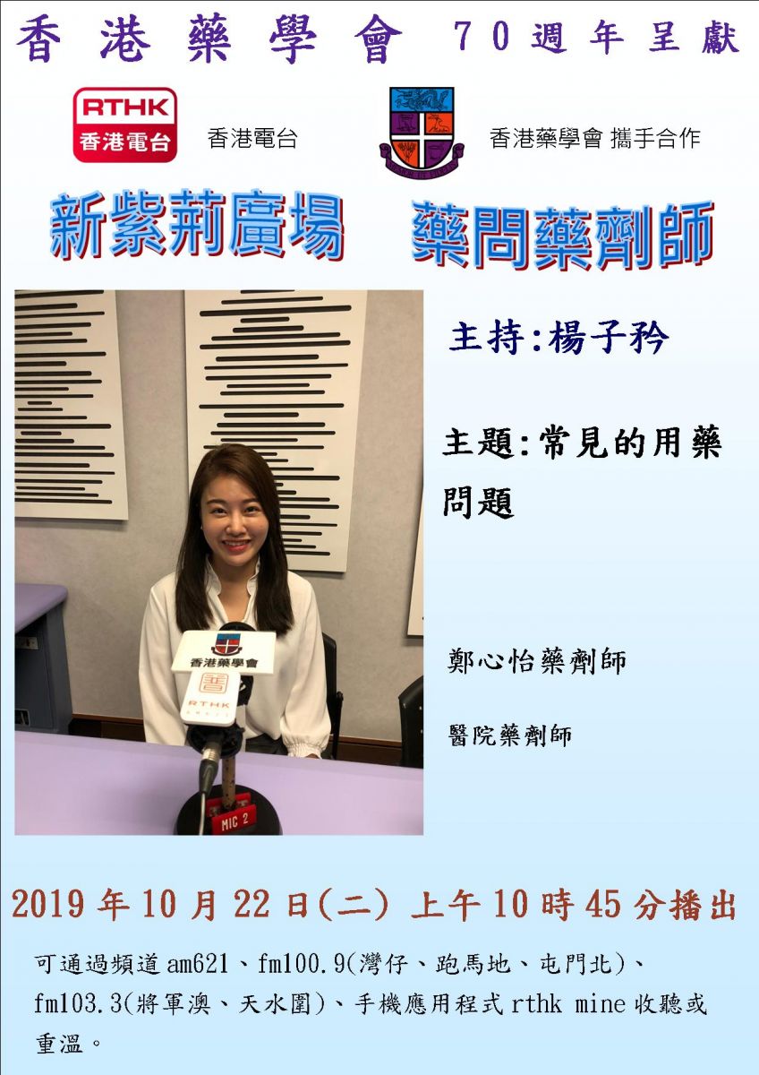 我非常榮幸能參與香港電台「新紫荊廣場」與香港藥學會合作錄製的「藥問藥劑師」環節。希望市民收聽這個環節後,能吸收不同的藥物或健康資訊,讓藥劑師成為你的健康好拍擋,為你的健康把關。
