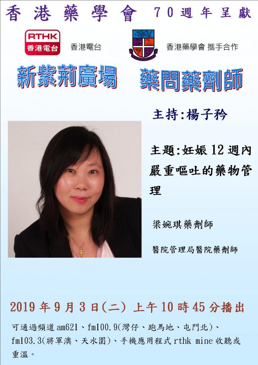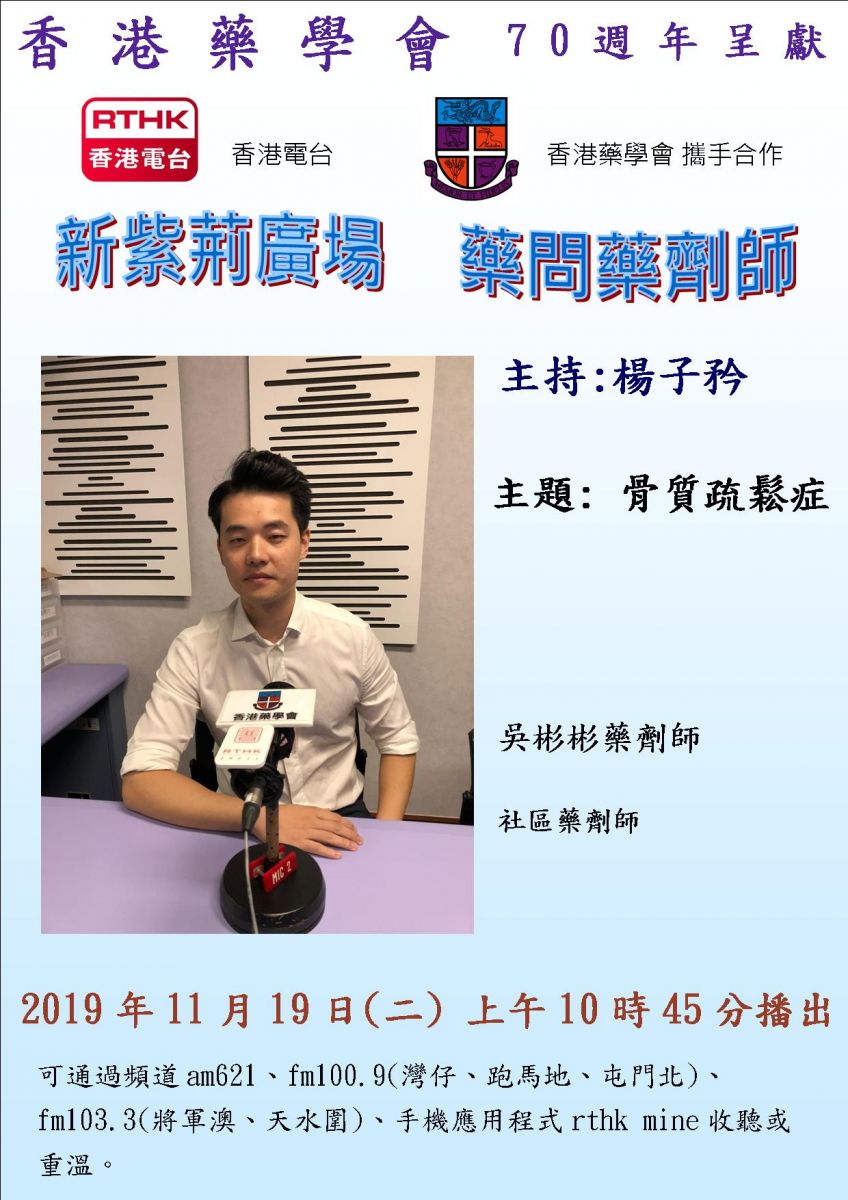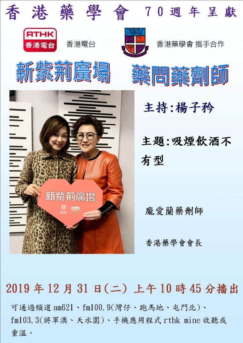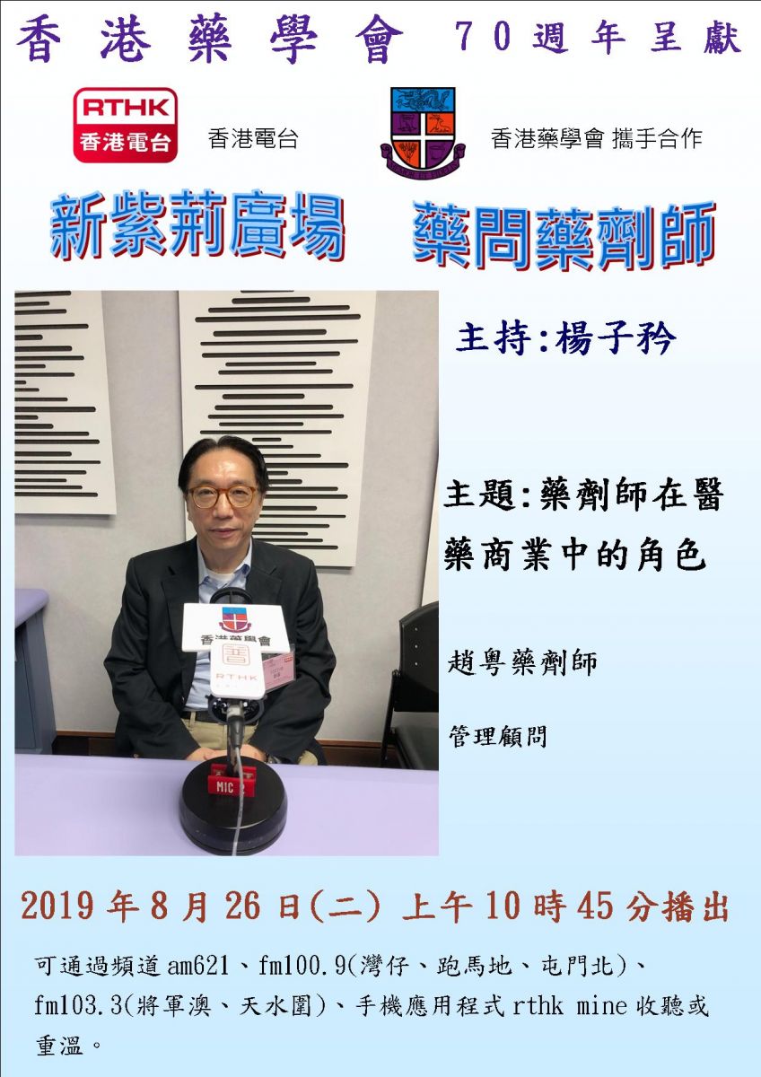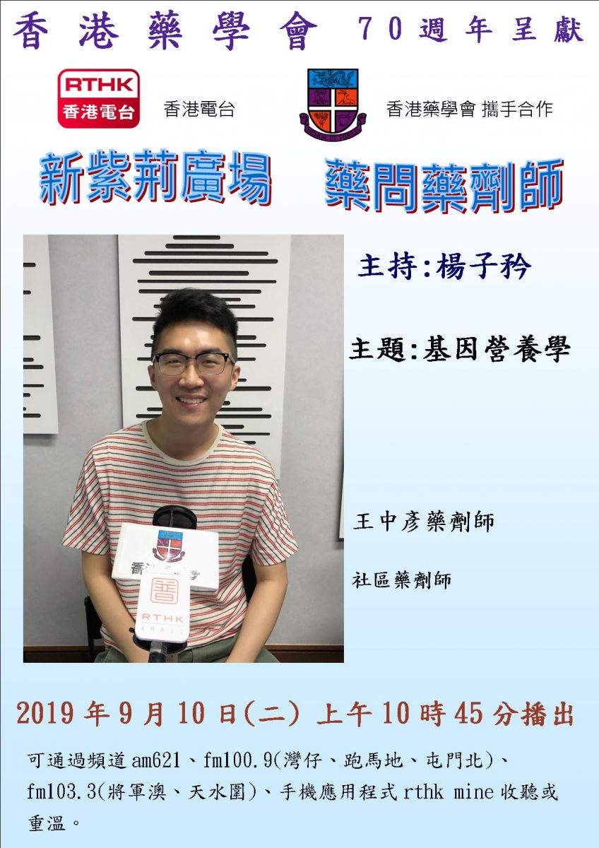 我非常榮幸能參與香港電台「新紫荊廣場」與香港藥學會合作錄製的「藥問藥劑師」環節。希望市民收聽這個環節後,能吸收不同的藥物或健康資訊,讓藥劑師成為你的健康好拍擋,為你的健康把關。