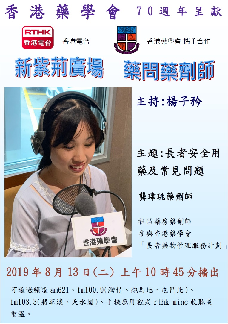 「藥問藥劑師」將會從2019年8月6日開始至12月31日,逢星期二上午1045播出。聽眾可通過頻道am621、fm100.9(灣仔、跑馬地、屯門北)、fm103.3(將軍澳、天水圍)、手機應用程式rthk mine 收聽。各位會員屆時要準時收聽或重溫!
