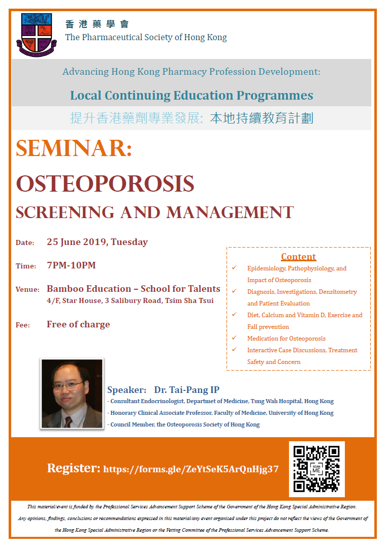 Thank you Dr. Ip for sharing years of clinical experience on its management and his 2013 OSHK Guidelines for Clinical Management of Postmenopausal Osteoporosis in Hong Kong with us!