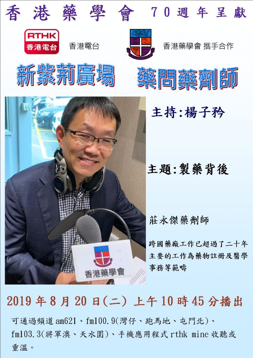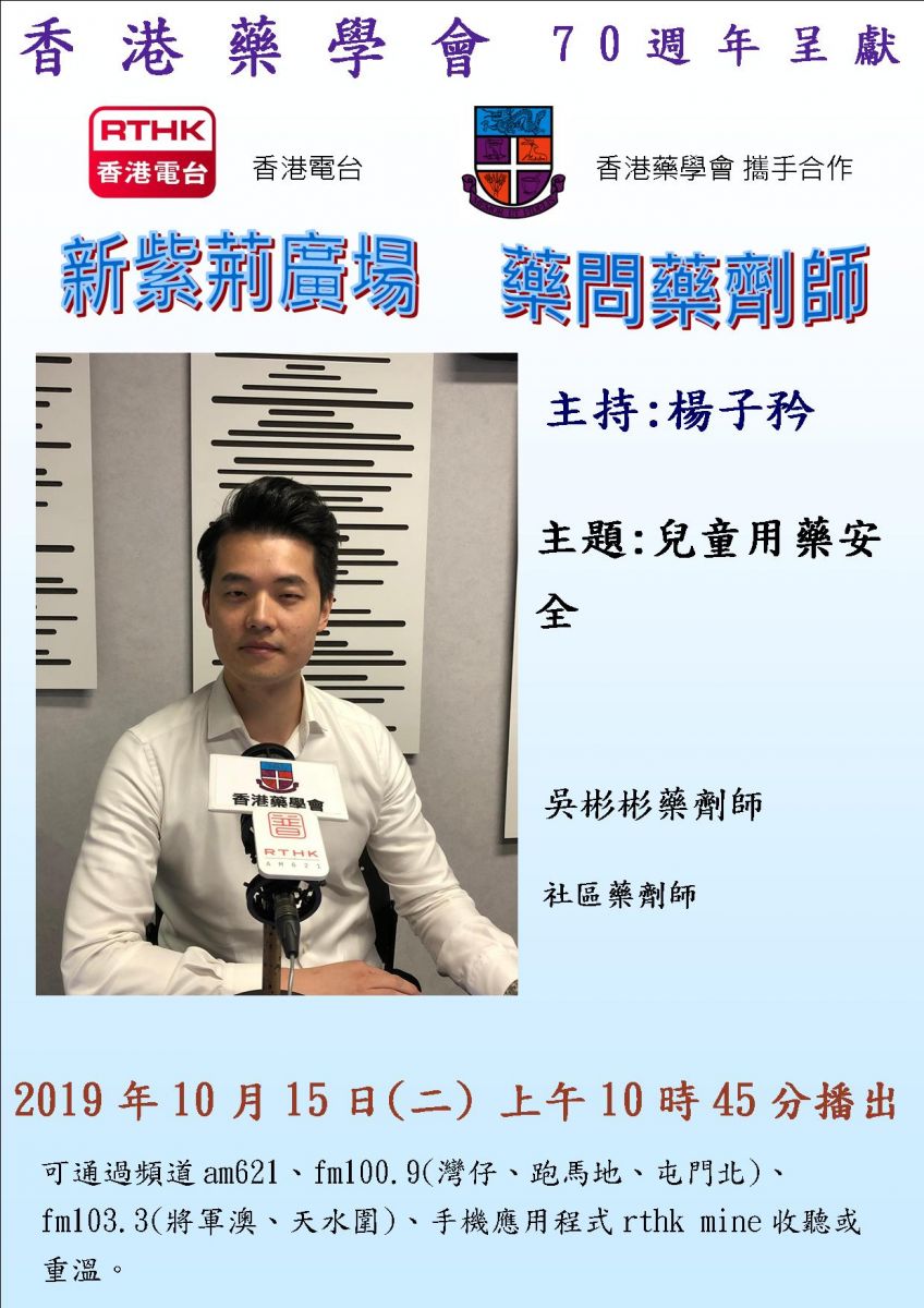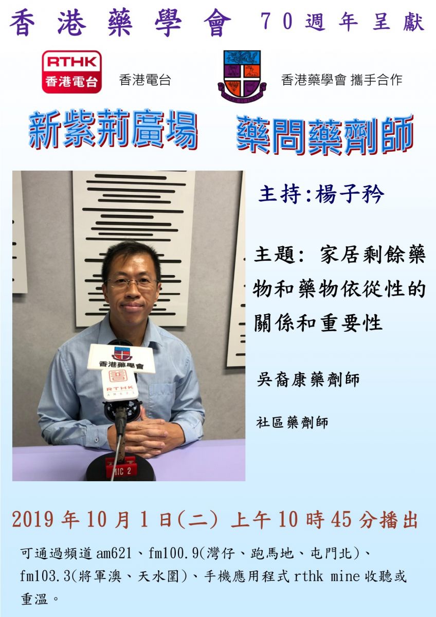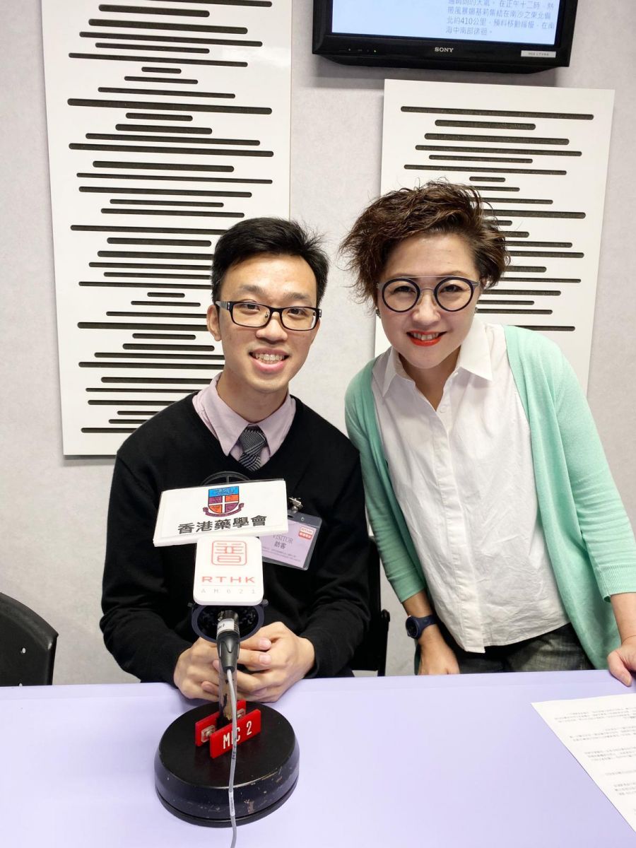 我非常榮幸能參與香港電台「新紫荊廣場」與香港藥學會合作錄製的「藥問藥劑師」環節。希望市民收聽這個環節後,能吸收不同的藥物或健康資訊,讓藥劑師成為你的健康好拍擋,為你的健康把關。