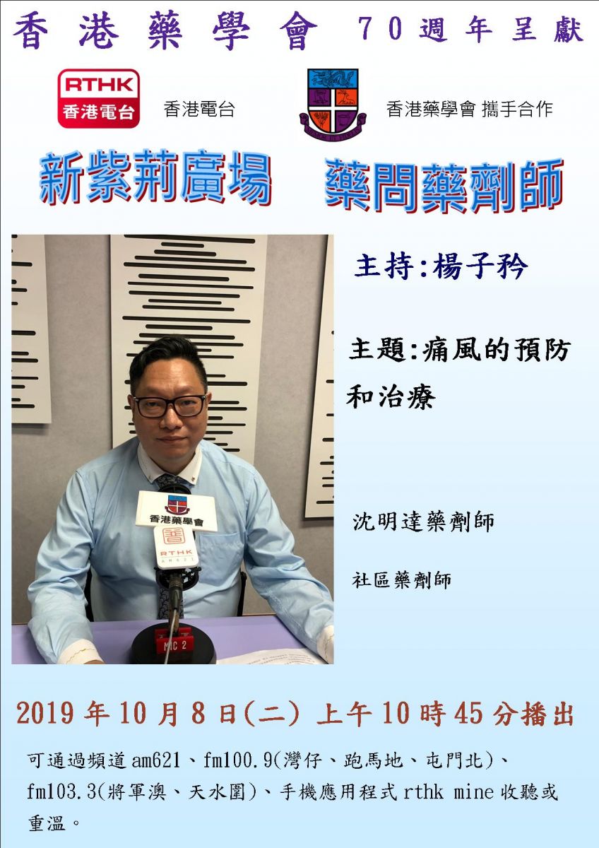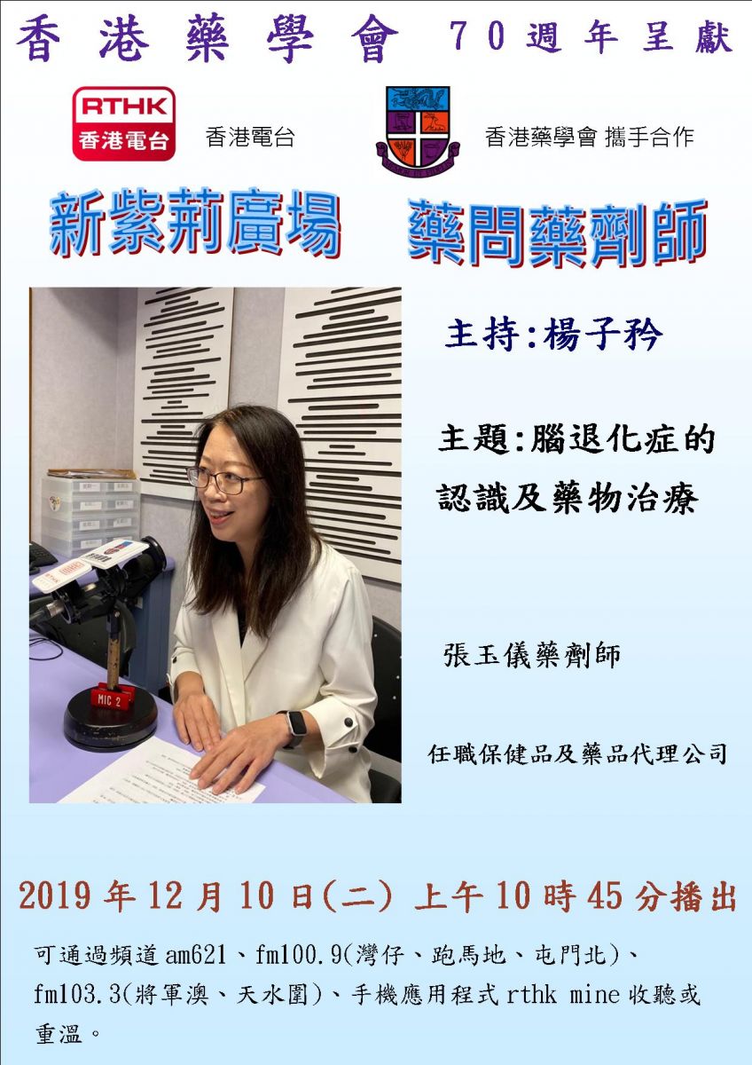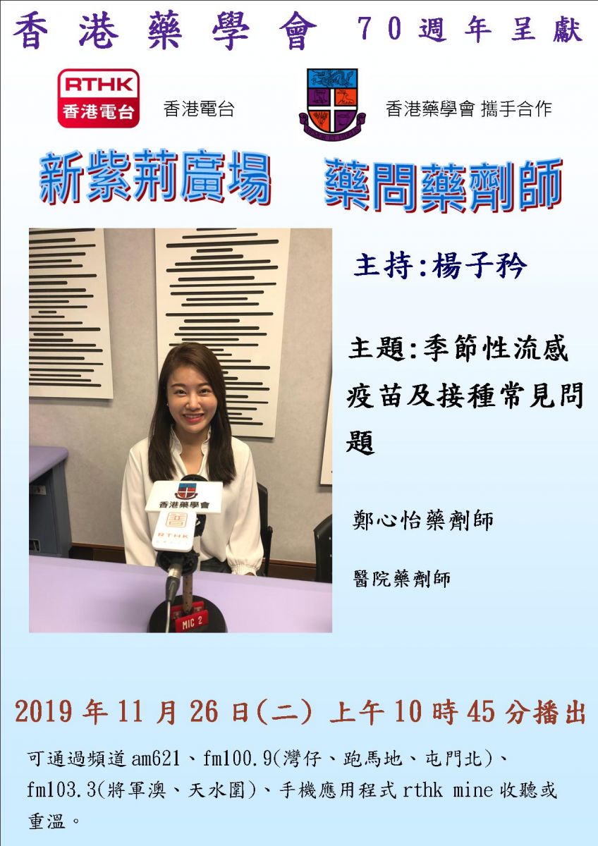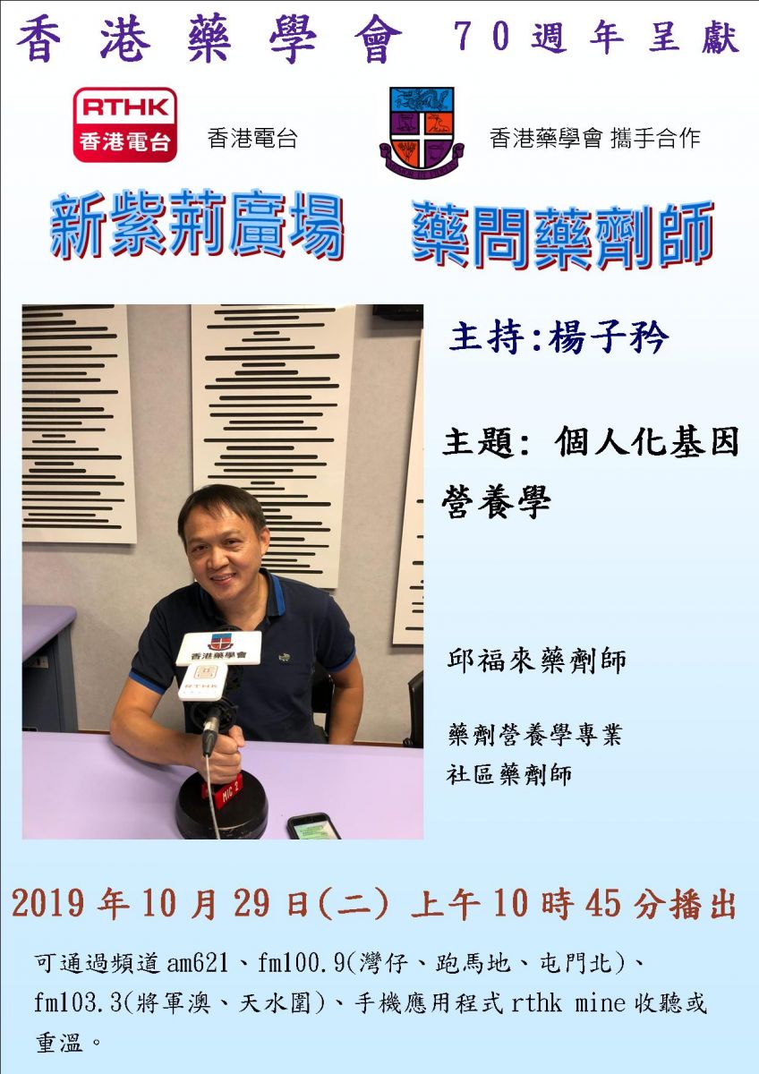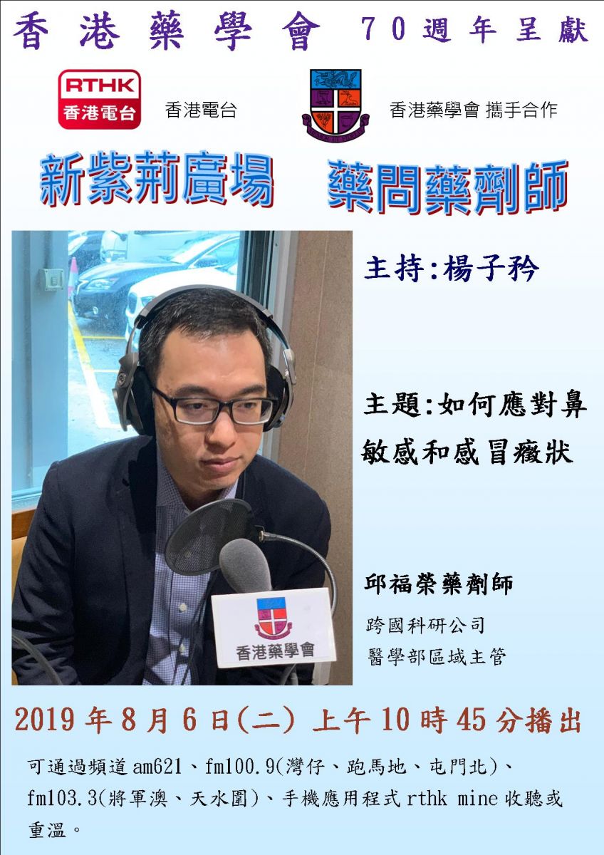 我非常榮幸能參與香港電台「新紫荊廣場」與香港藥學會合作錄製的「藥問藥劑師」環節。希望市民收聽這個環節後,能吸收不同的藥物或健康資訊,讓藥劑師成為你的健康好拍擋,為你的健康把關。