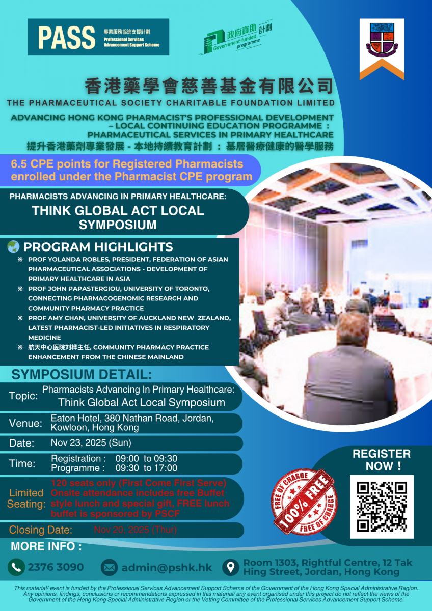 The Pharmaceutical Society Charitable Foundation Limited, a division of the Pharmaceutical Society of Hong Kong (PSHK) is pleased to announce an upcoming one-day symposium, “Pharmacists Advancing Primary Healthcare: Think Global Act Local”