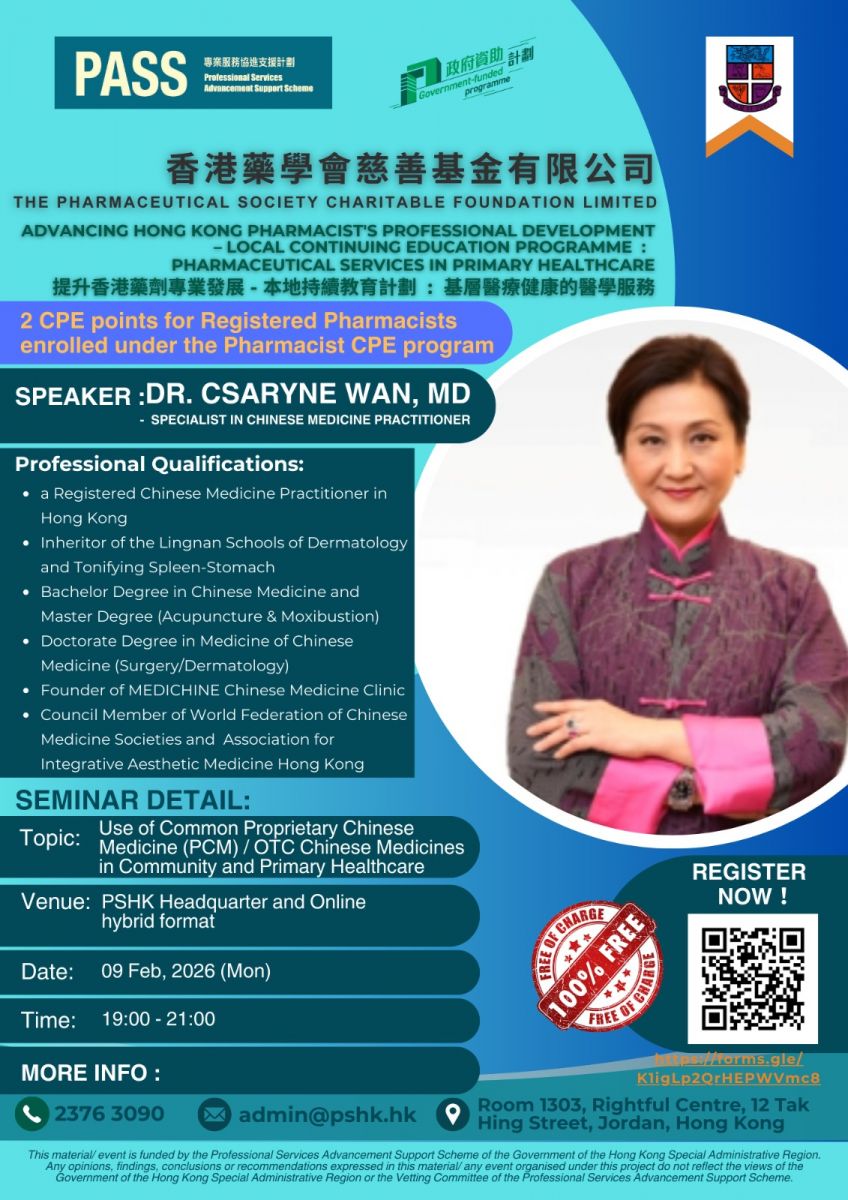 Topic: Use of Common Proprietary Chinese Medicine (PCM) / OTC Chinese Medicines in Community and Primary Healthcare